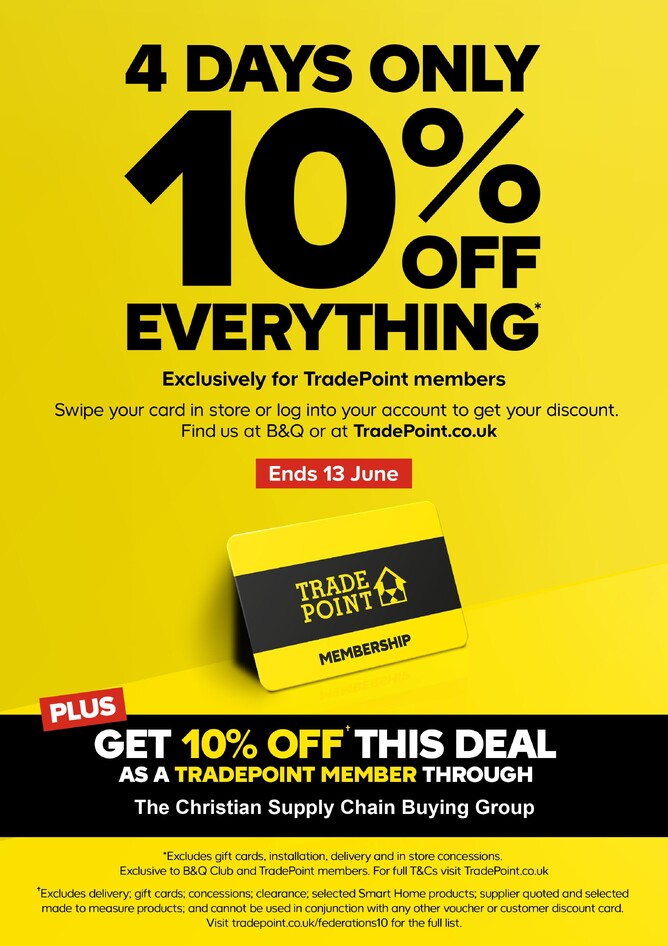 * 10% off exclusive to TradePoint and B&Q Club members. For B&Q Club members,10% off everything applies to products sold in store only, online excludes products sold and shipped by verified sellers. Offer excludes gift cards, installation, delivery and in store concessions. Valid from 10/06/2022 to 13/06/2022 inclusive. To receive the discount the cardholder must present their membership card at the time of purchase at the till or checkout online. Offer cannot be used in conjunction with staff discount. The discount may be withdrawn by B&Q at any time and without notice and is subject to reasonable use. These terms supplement the terms applicable to the B&Q Club and Diamond Club and TradePoint membership schemes. In the event of any conflict between those terms and these terms, these terms shall prevail with respect to the discount. The Promoter: B&Q Ltd, B&Q House, Chestnut Avenue, Chandlers Ford, Eastleigh