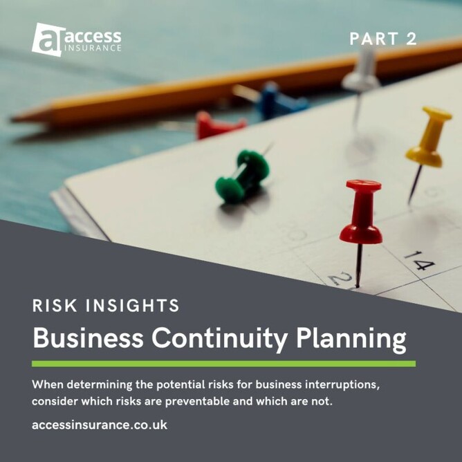 When determining the potential risks for business interruptions, consider both environmental risks and human risks. Additionally, consider which risks are preventable and which are not.