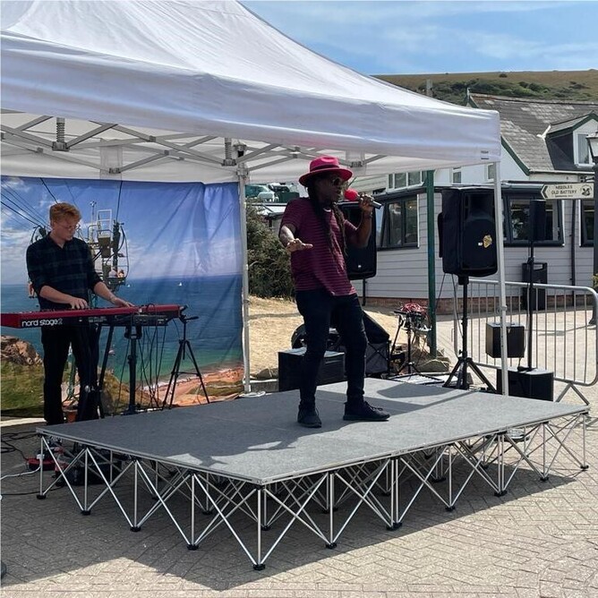 Thanks to our one and only Sharon Herbert, who took this superb shot of an Ultralight Stage in action at The Needles, Isle of Wight. It's the perfect performance platform for this talented duo, who can take it down and pop it in the boot of their car at the end of their gig.
