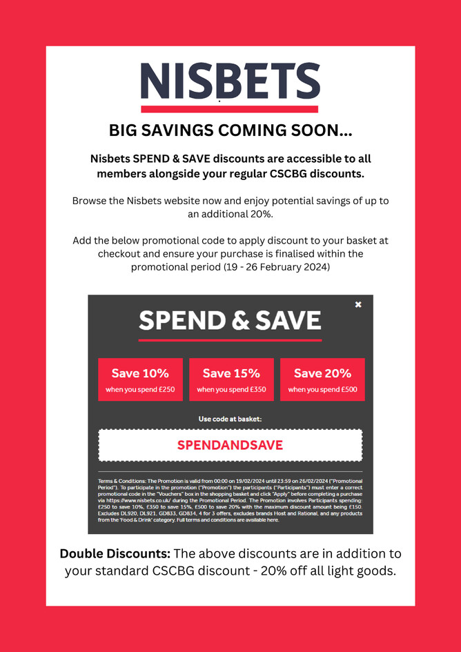 Save up to an additional 20% on top of yiour existing CSC Buying Group discount with Nisbets - Offer ends 23:59hrs on 26th February 2024