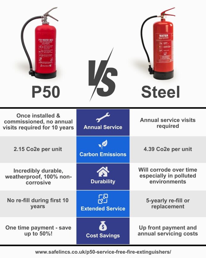 When compared to steel extinguishers, we usually see these key benefits for customers that switch to P50 Extinguishers: