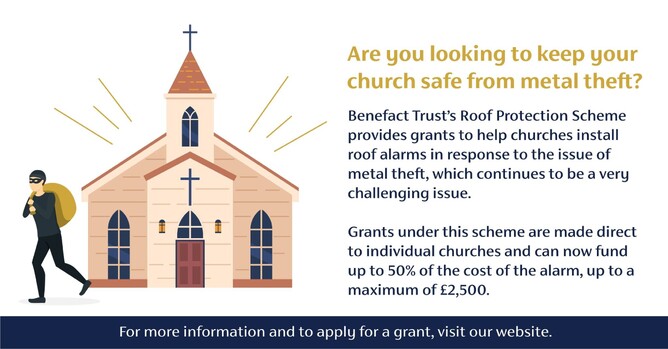 Benefact Trust’s Roof Protection Scheme provides grants to help churches install roof alarms in response to the issue of metal theft, which continues to be a very challenging issue.