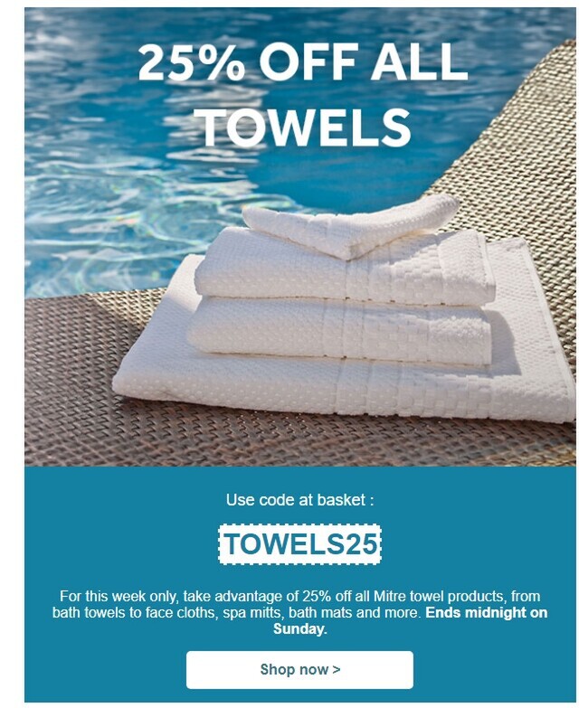 Get 25% off all Mitre towels. Don't miss out: offer ends SUNDAY 14th July!