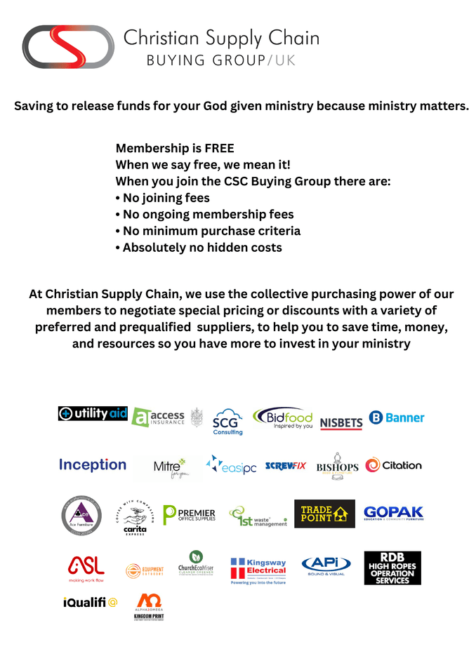 This is where the Christian Supply Chain Buying Group UK (CSCBG) can help. We are a Christian resource ministry with an established track record of combining the purchasing power of its members to save them money and helping them free up their time and resources so they can concentrate on their primary ministry or business purpose.