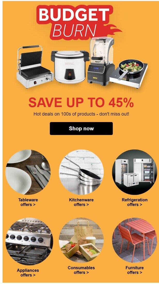 Nisbets, the UK's leading supplier of catering equipment, is currently offering exceptional discounts of up to 45% on a wide range of products through their “Budget Burns” promotion. This is an excellent opportunity for businesses to acquire high-quality equipment at significantly reduced prices.
