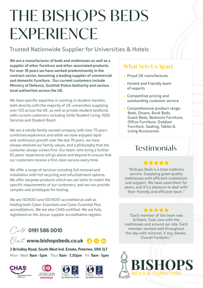 To access CSC Buying Groupβs specially negotiated contract pricing across the full Bishops Beds product range, simply set up your account today and contact us at buy@cscbg.org.uk