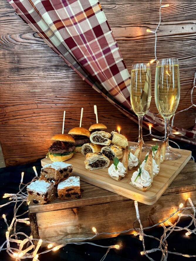 his year’s party food line-up showcases a mix of tradition and modern tastes: mini Ardgay venison burger sliders with tasty Arran Chutney, classic Macsween haggis bridies, and Sheese vegan cheese tattie scone canapés, all finished with Cobbs gluten-free Stollen bites and a well-deserved glass of fizz.