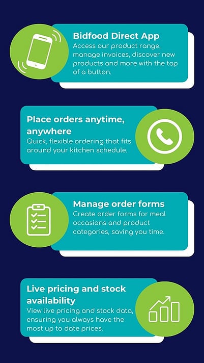 Products: Whether you’re looking for fresh, frozen, or chilled foods, Drinks, Meat & Poultry, Fish & Seafood, Bakery, Desserts & Ice cream, Fruit & Veg, Dairy & Eggs, Delicatessen, Prepared Meals & Buffets, Snacks and catering supplies, Bidfood offer it all! As a buying group we also partner with key suppliers available through Bidfood to bring you best choice and offering.