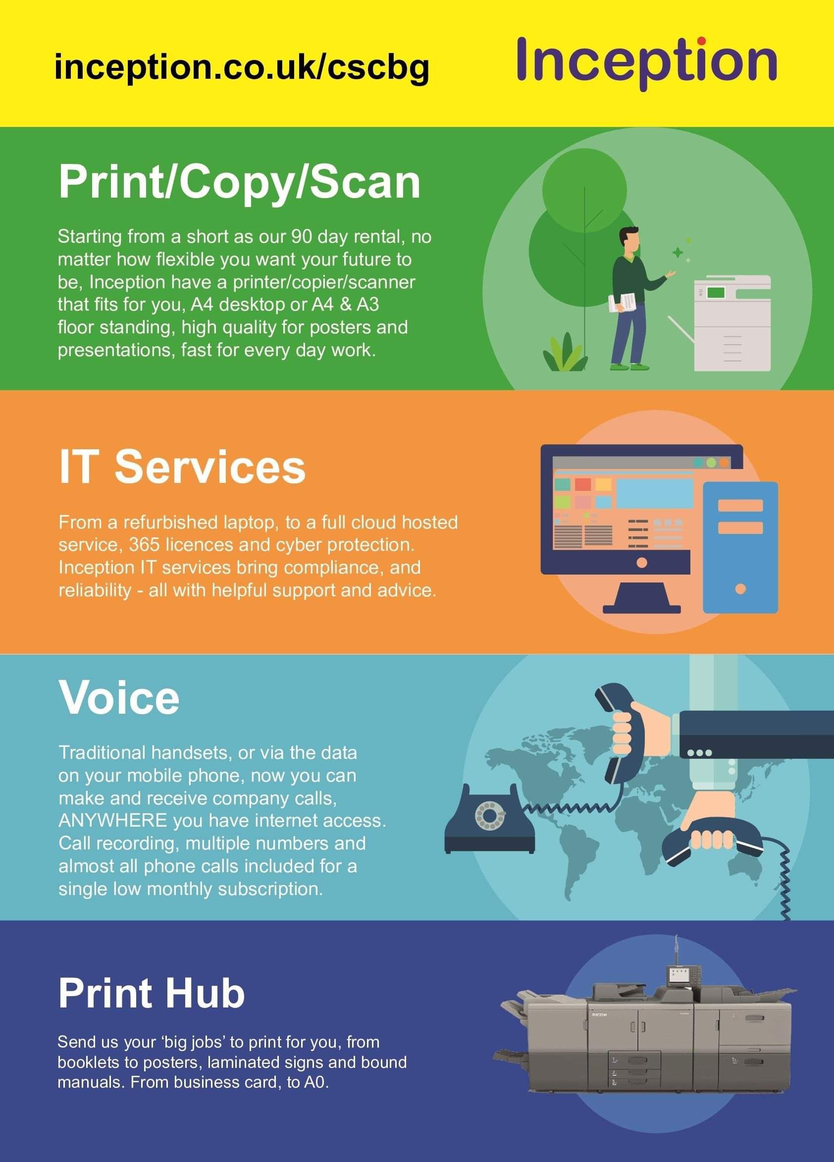 Inception have partnered with CSCBG to offer Managed IT services, Computer devices, Hardware and software plus a range of brand new and refurbished office printers and photocopiers at exclusive discounted prices across a range of brands.
